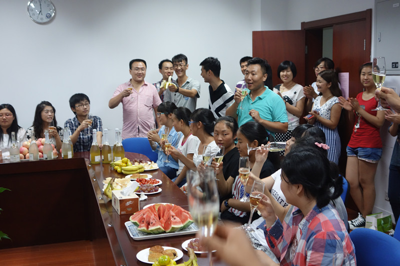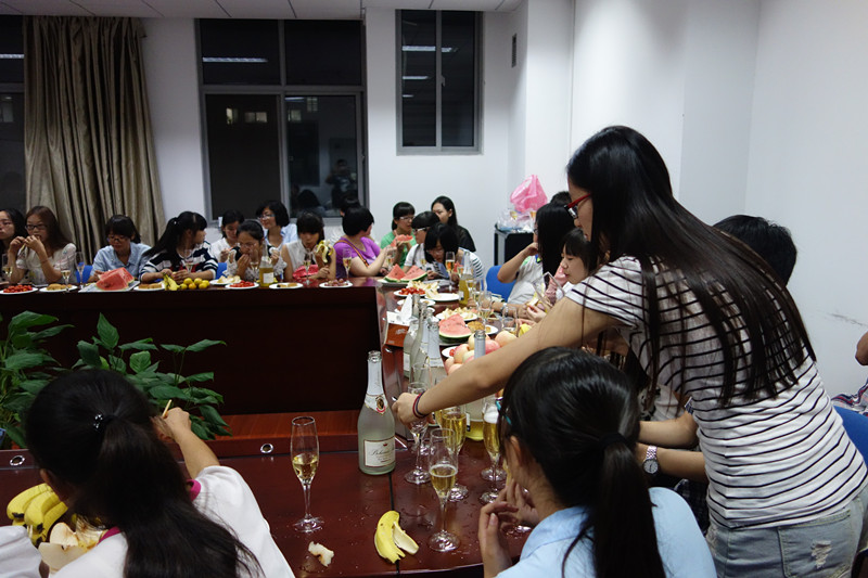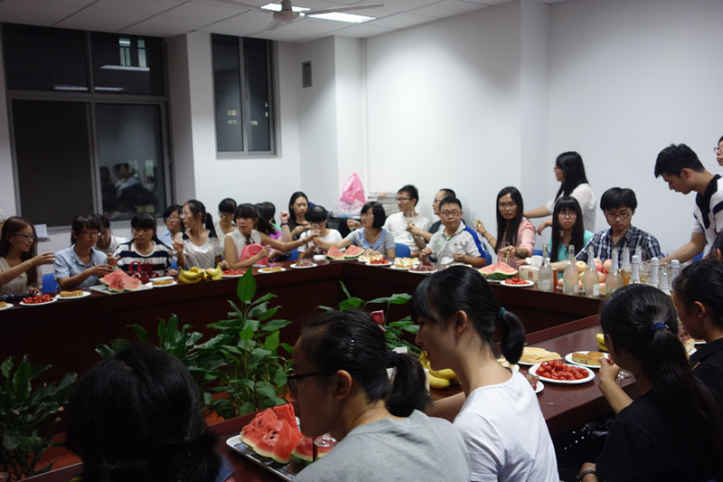会议室和学院的辅导员老师,学长学姐们共度中秋。整齐摆放的各式水果,甘甜醇口的香槟,以及必不可少的月饼,相信对于他们来说,大学的第一次中秋节是记忆深刻而难忘的。
