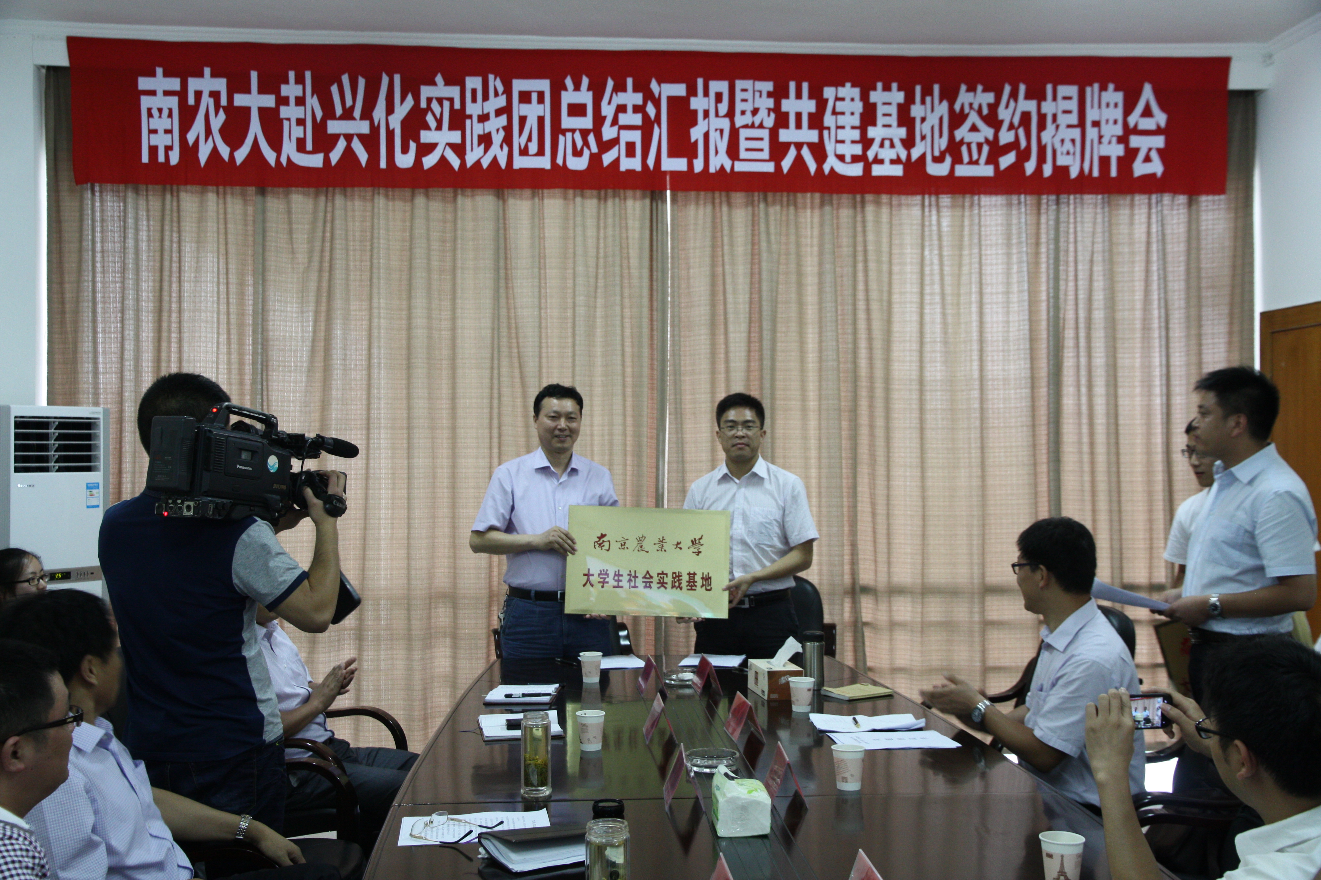 2014年7月14日下午,“南农大赴兴化实践团总结汇报暨共建基地签约揭牌会”在兴化市政府林牧业局举行,出席会议的有兴化市林牧业局陈友洪局长、共青团兴化市委员会吉金楼书记、兴化市大邹镇党委刘启元书记、兴化市委组织部人才科袁文华科长,共青团南京农业大学委员会夏镇波书记、博彩论坛-唐人博彩论坛