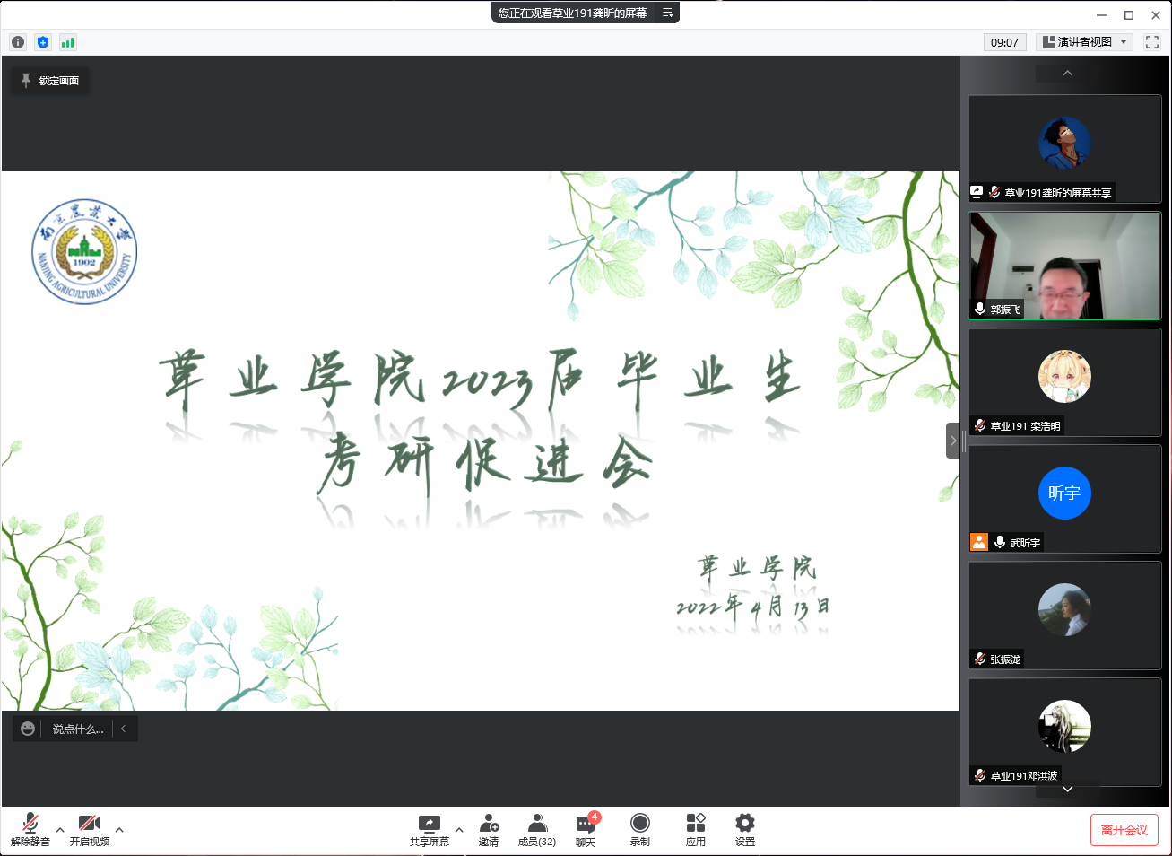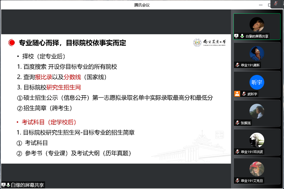 院长郭振飞、院党总支副书记副院长高务龙、团委书记辅导员武昕宇、草业191班班主任庄黎丽、草业国际191班班主任覃凤飞和草业2019级全体本科生参加了会议,会议还邀请了2018级考研成功“上岸”的范启航、蔡欣宇、白缘和梁梦琪等4位同学做了经验分享,会议由武昕宇主持。