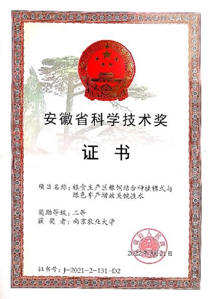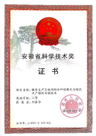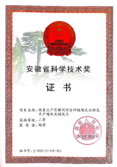 邵涛教授、刘秦华副教授参加、南京农业大学为第二完成单位的研究成果“粮食主产区粮饲结合种植模式与绿色丰产增效关键技术”获得安徽省科学技术奖二等奖。