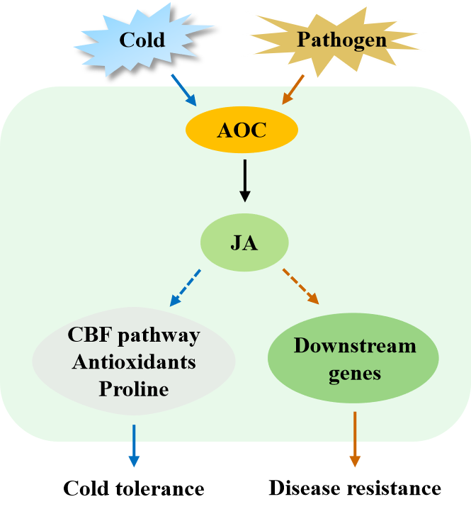 该研究团队发现低温和病原菌诱导黄花苜蓿和蒺藜苜蓿AOC2的表达,过表达黄花苜蓿MfAOC2的转基因蒺藜苜蓿提高耐寒、抗病性,蒺藜苜蓿同源基因MtAOC2的Tnt1插入突变体mtaoc2降低了耐寒、抗病性,表达MfAOC2能恢复mtaoc2的耐寒性和抗病性。进一步研究发现,这些遗传材料的表型与JA密切相关。低温下或接种病原菌后过表达MfAOC2的JA含量及JA信号通路下游基因表达水平提高,低温响应CBF途径基因表达水平、抗氧化酶活性和脯氨酸含量提高,而突变体JA含量及JA信号通路下游基因表达水平低于野生型,低温响应CBF途径基因表达水平、抗氧化酶活性和脯氨酸含量也低于野生型。外源MeJA处理能恢复mtaoc2突变体的耐寒性和抗病性,JA信号通路下游基因表达水平、低温响应CBF途径基因表达水平、抗氧化酶活性和脯氨酸含量都提高,表明AOC2调控耐寒、抗病性与JA有关。综上所述,该研究揭示了MfAOC2和MtAOC2表达调控JA生物合成及其信号转导途径,调节CBF途径、抗氧化防御系统和脯氨酸合成,进而提高苜蓿耐寒、抗病性。AOC2基因同时调控耐寒和抗病性,值得进一步在苜蓿分子育种中应用。