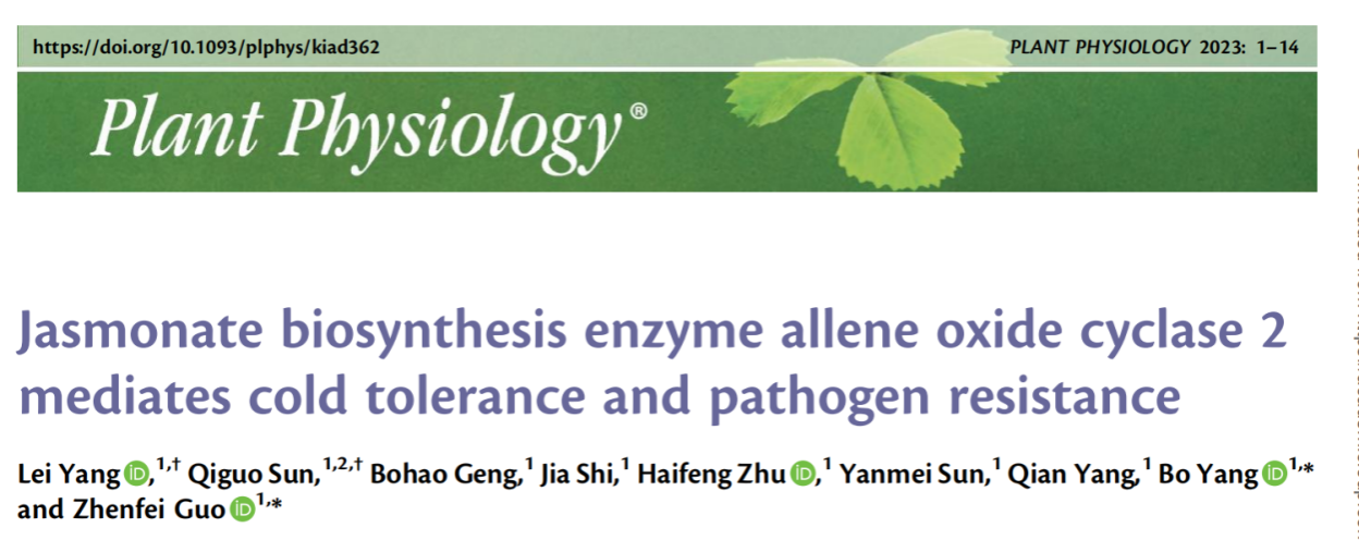 郭振飞教授团队在Plant Physiology发表题为“Jasmonate biosynthesis enzyme allene oxide cyclase 2 mediates cold tolerance and pathogen resistance”(茉莉酸生物合成关键酶AOC2介导耐寒和抗病性),揭示了MfAOC2调控JA生成,介导苜蓿耐寒和抗病性的分子机制。