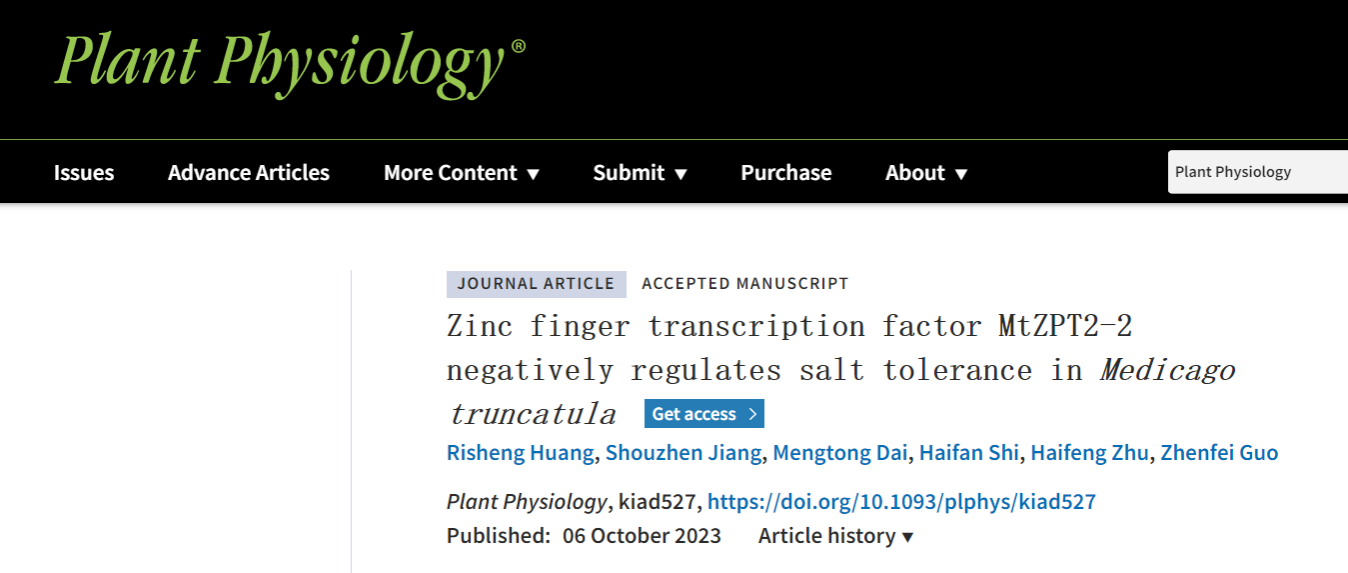 近日,南京农业大学郭振飞教授团队在Plant Physiology在线发表了题为“Zinc finger transcription factor MtZPT2-2 negatively regulates salt tolerance in Medicago truncatula”的研究论文,揭示了锌指转录因子MtZPT2-2直接抑制高亲合性钾离子转运体MtHKT1;1和MtHKT1;2的表达负调控蒺藜苜蓿耐盐性的分子机制。