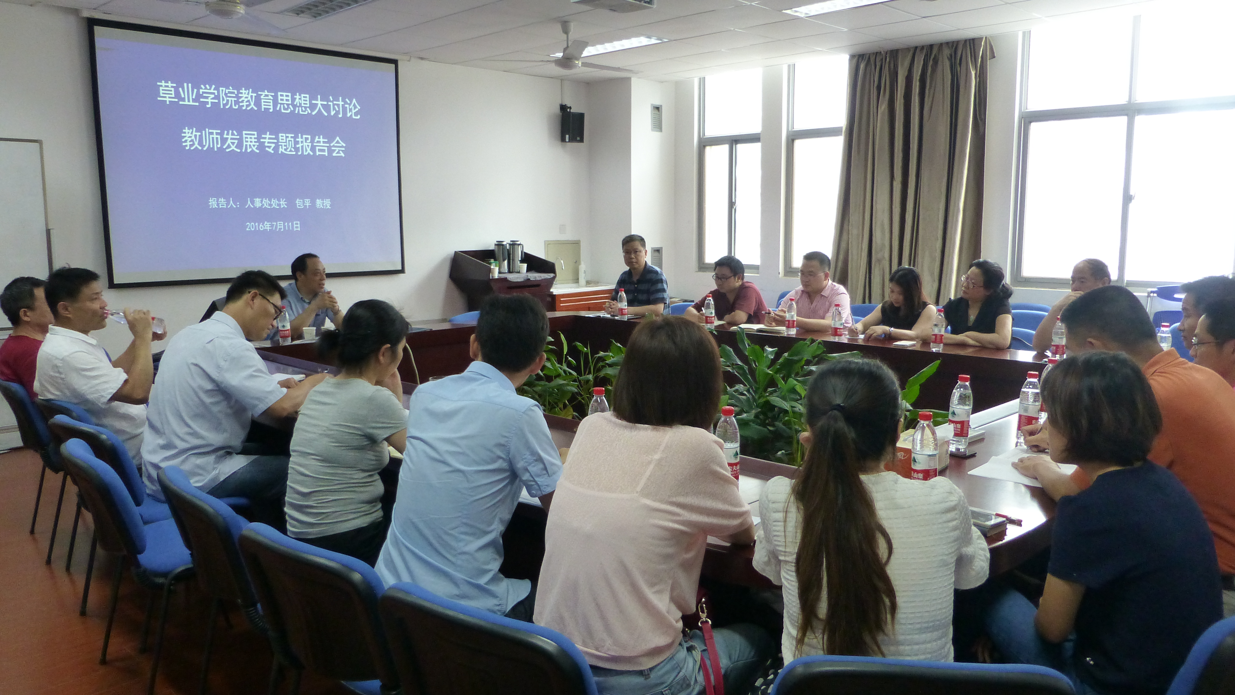 2016年7月11日下午,博彩论坛 在理科南楼院会议室举办教育思想大讨论教师发展专题报告会。报告由人事处处长(人才工作领导小组办公室主任)包平教授主讲,博彩论坛 党总支书记李俊龙主持,博彩论坛 全体教职工参加了报告会。 包平报告分三部分:一是回顾了2014年以来国家事业单位人事管理改革的相关政策,重点解读了《事业单位人事管理条例》以及相关文件精神;二是介绍了学校和博彩论坛 教师队伍的基本情况和发展现状,分析了师资队伍的优势和存在的问题;三是结合学校即将出台的人事制度改革办法,从岗位设置、聘用制度、考核与晋升、薪酬制度设计等方面进行了详细的解读。