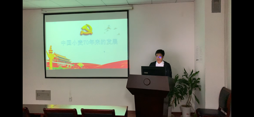 首先,陶柱君同志开展了“中国小麦生产70年”的微党课,他讲到中国小麦70年来亩产逐年升高,2008达到了317.5公斤/亩。无数科研工作者为小麦的育种工作付出了巨大的贡献,其中代表人物有中国科学院院士、著名小麦遗传育种学家李振声等。李振声院士不惧条件艰苦,带领课题组进行小麦远缘杂交育种试验,攻坚克难,突破重重考验,最终育成了具有相对持久的抗病性、高产、稳产、优质的小麦新品种——小偃6号。正因为无数科研工作者坚定理想信念,不怕艰难险阻,坚持不懈的努力,为我国粮食的增收做出了巨大奉献。