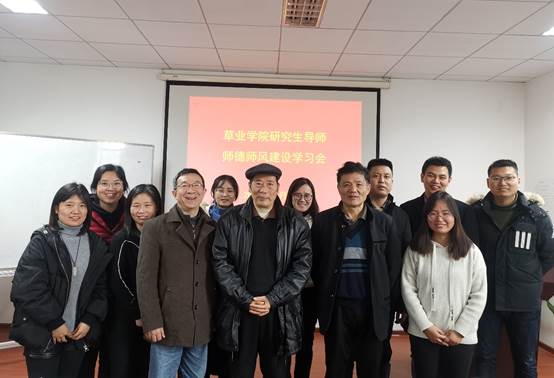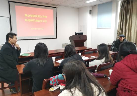 举行研究生导师师德师风建设学习会,邀请学校“立德树人楷模”植物保护学院韩召军教授、校学工处副处长李献斌副教授面向研究生导师开展师德师风建设学习指导活动。会议由副院长徐彬主持。