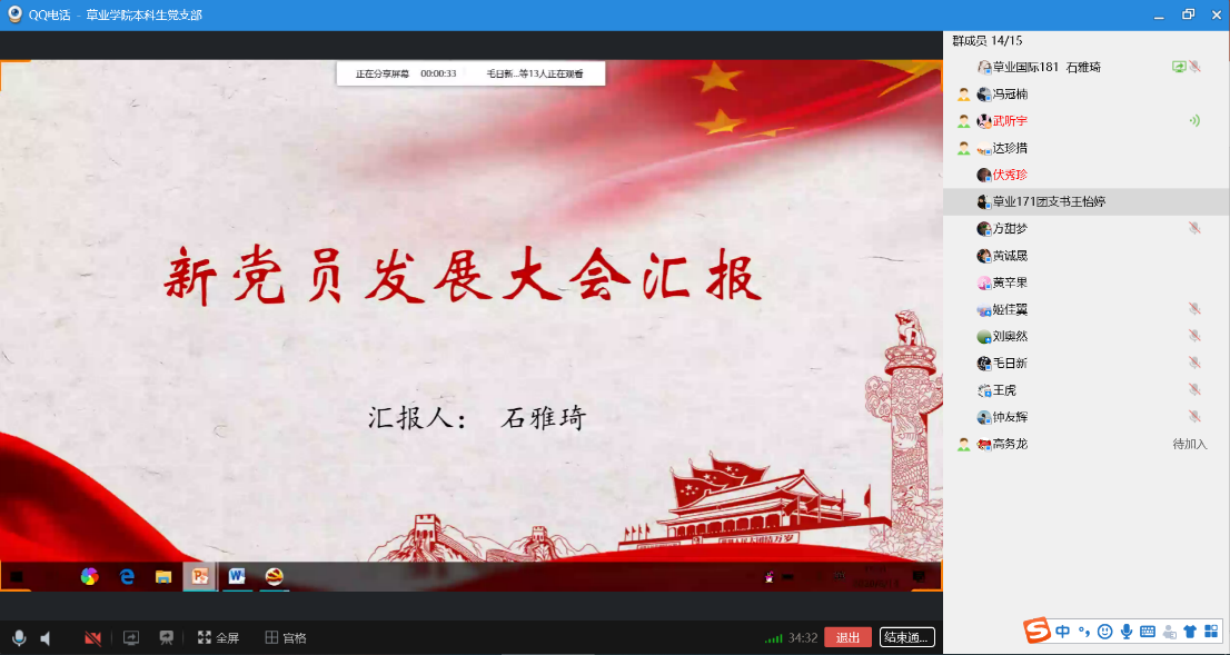 本科生党支部利用QQ视频在线上召开预备党员接收大会,本科生党支部书记武昕宇主持了本次会议。本科生党支部全体党员出席了本次会议。