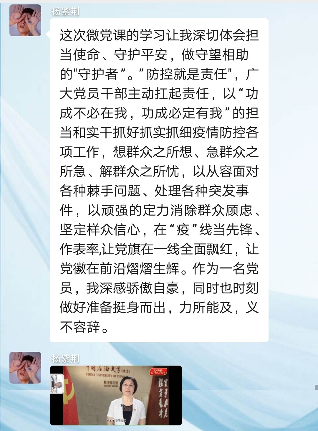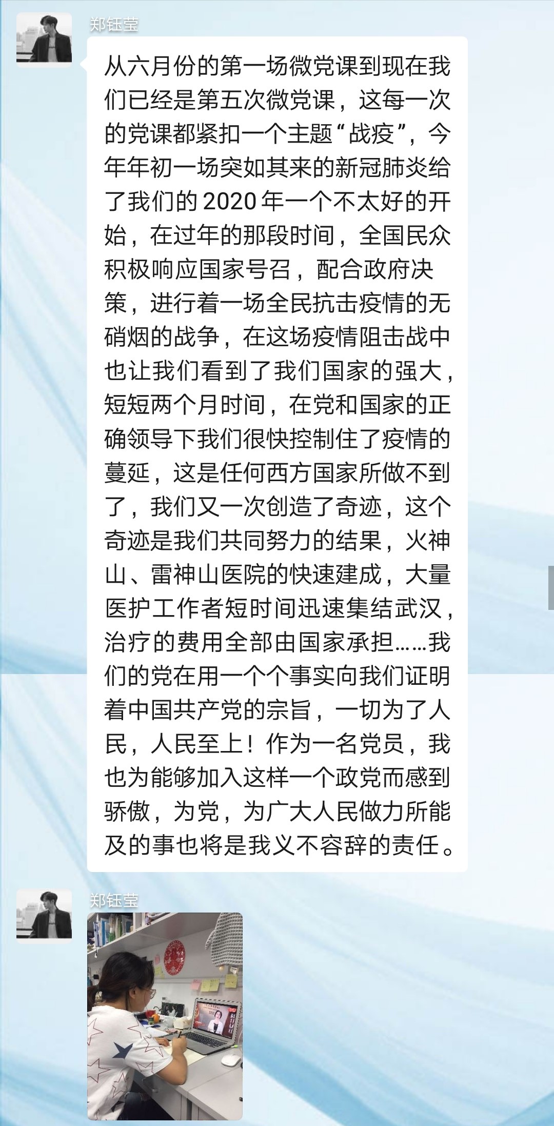 第三党支部各师生党员按例以线上自行学习方式第一时间认真收看战“疫”示范微党课。