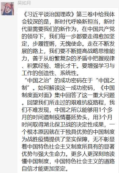 会议第二项,党支部线下参会同志结合前期所学和《习近平谈治国理政》第三卷第三章,共同探讨中国制度的优点与不足、中国制度管理下的中国发展等方面话题,并对自己有深刻影响的内容做相关延伸讨论。