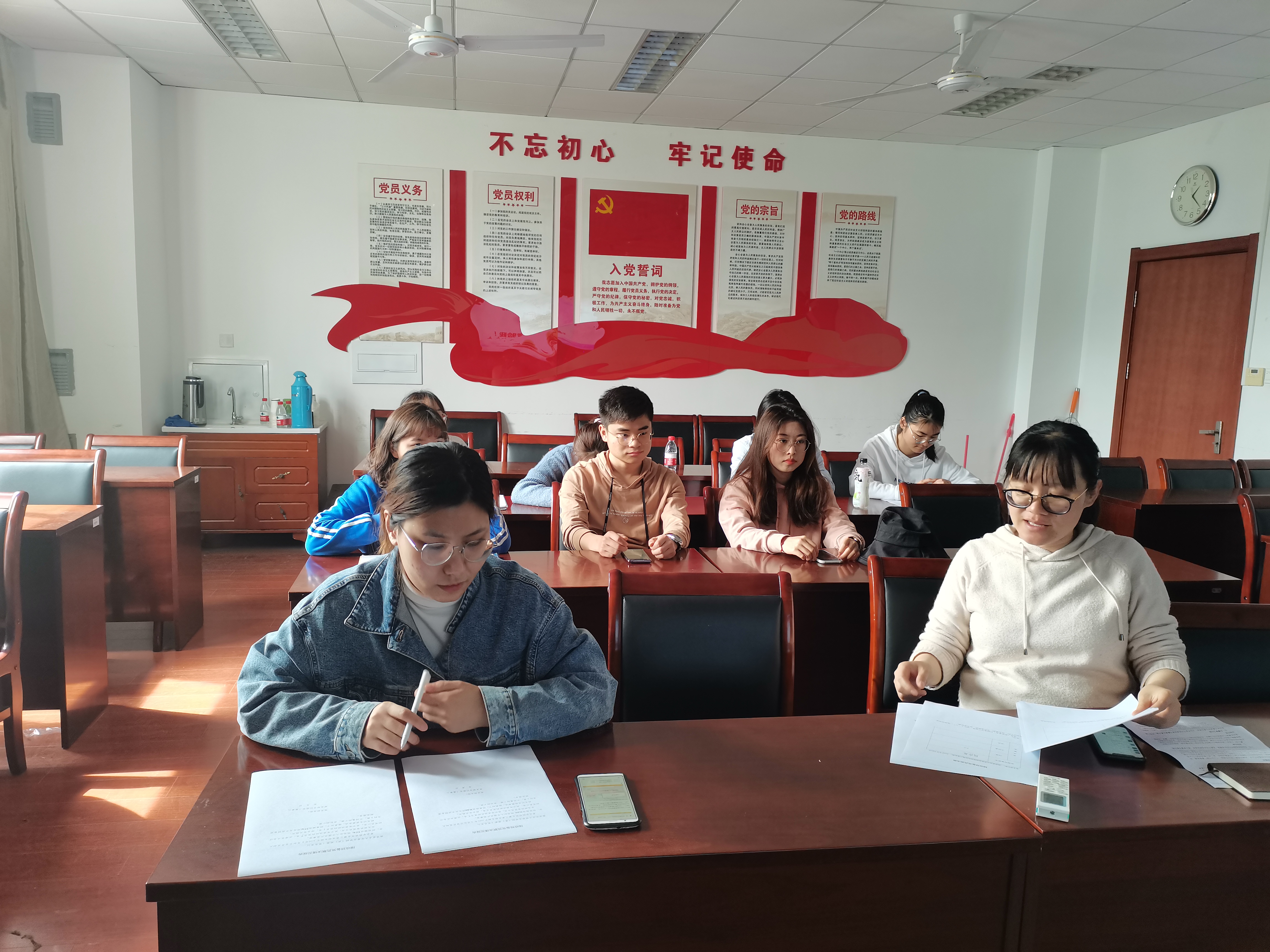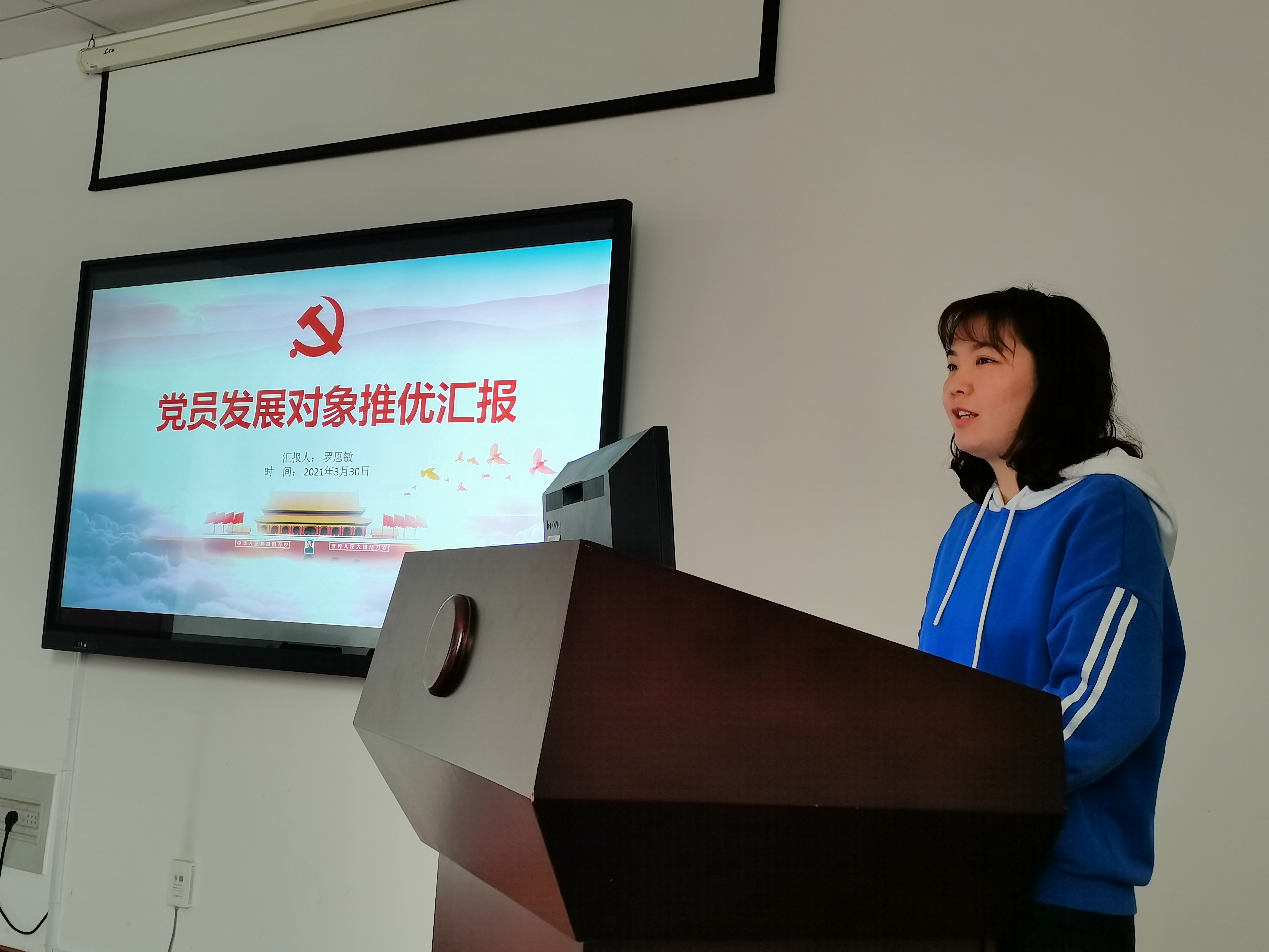 会议第一项,按照党组织接收预备党员的程序,两名发展对象罗思敏和殷庭超就他们自身情况、入党动机和对党的认识进行了简短汇报,支部副书记张晴和党员郑钰莹作为入党介绍人向支部全体党员同志简要介绍了入党发展对象的政治思想、学习、科研工作生活情况,随后由支部书记赵娜作政审情况说明,并对罗思敏和殷庭超两名发展对象是否符合党员条件发表了意见。