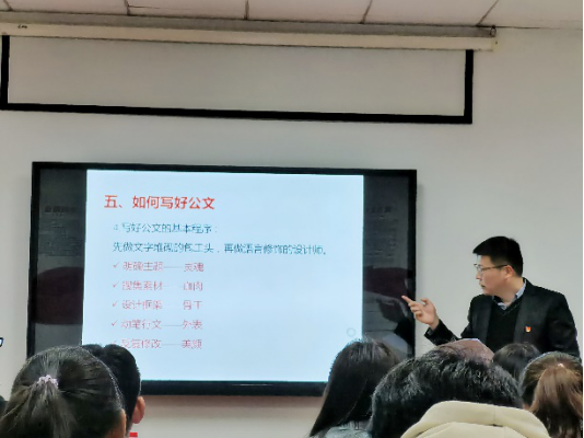 庄老师在培训伊始提出“公文写作,先看外表,再看骨干,再看内涵”。后分别对公文字体格式,致辞讲话、主题报告、新闻稿三种文体的撰写结构与事项,以及写好公文的要点做出了详细的阐释。