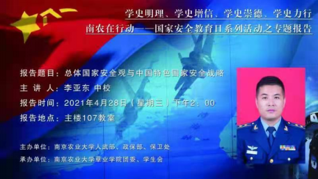 2021年4月28日14:00,南京农业大学人武部、政保部、保卫处开展“学史明理、学史增信、学史崇德、学史力行、南农在行动——国家安全日系列活动之专题报告”。为调动积极分子参与活动积极性,提高党性修养,研究生第二党支部党员唐小月带领支部积极分子参加了此次报告会。