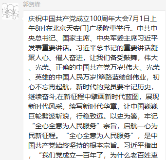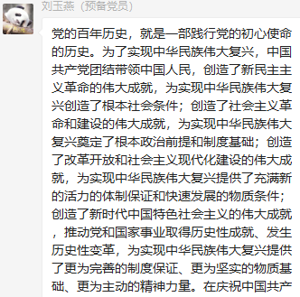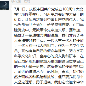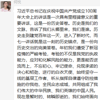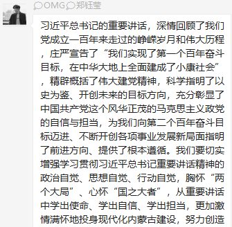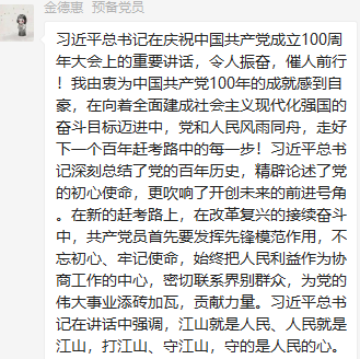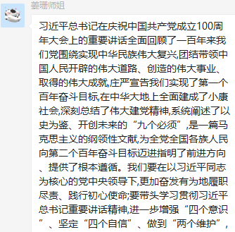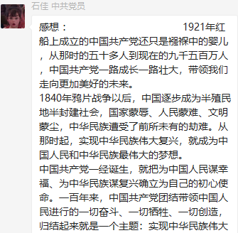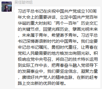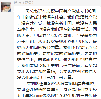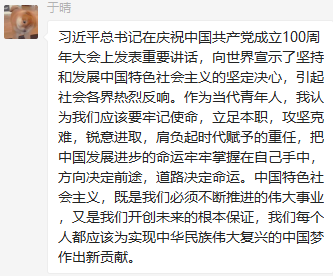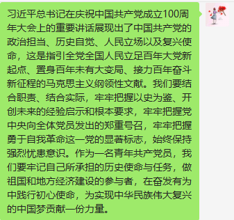 董瀛潞同志在博彩论坛 研究生第三党支部党员群中分享了与习近平总书记在庆祝中国共产党成立100周年大会上的重要讲话相关的资料和视频,党支部各党员在群里积极发表学习心得。中国共产党的先驱们不怕牺牲、英勇斗争,开创了中国历史新纪元。我们要继续弘扬光荣传统、赓续红色血脉,永远把伟大建党精神继承下去并发扬光大。作为新时代的青年党员,我们要以实现中华民族伟大复兴为己任,牢记“请党放心、强国有我”的铮铮誓言,长志气、有骨气、添底气,成为堪当民族复兴重任的社会主义建设者和接班人。