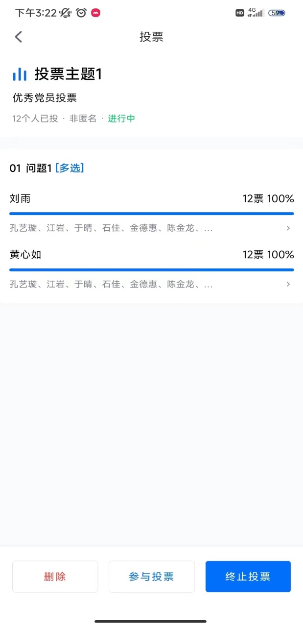 接下来由此次优秀党员同志竞选人刘雨同志和黄心如同志进行自身情况汇报,汇报结束后进行投票,投票数达到全体党员同志半数以上,此次投票有效。