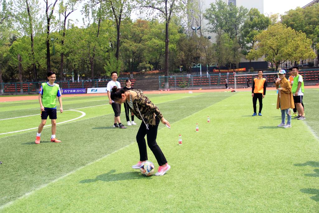中场休息期间进行了趣味赛环节,在场所有同学都参与其中,被随机分为五组开展游戏。趣味赛由带球绕桩、足球保龄球、和足球九宫格三个环节组成,颇具创意的接力赛赛制激发了在场所有同学的激情,气氛轻松愉快,最终第五组以最短的时间赢得了趣味赛环节的胜利。