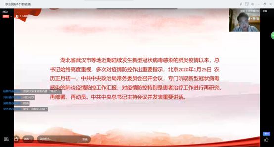 冯冠楠同学带领支部成员回顾了此次疫情“攻坚战”的发展历程,并讲了几个抗击疫情过程中发生的感人故事,最后表达了自己对于此次疫情“攻坚战”的感受。