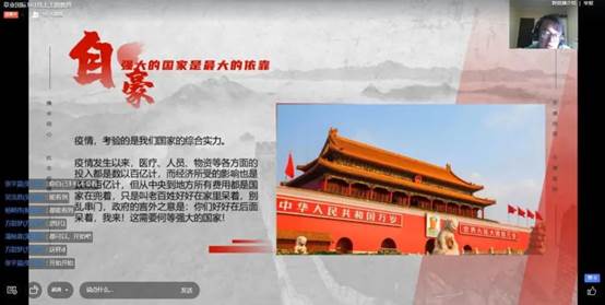 理论宣讲部分由班长杨朝伟同学带来,他的宣讲题目为“加强制度自信,夺取疫情防控阻击战全面胜利”,宣讲主要围绕制度自信展开,告诉我们只要坚持制度自信,充分发挥中国特色社会主义制度优势,万众一心,团结奋斗,就一定能够取得疫情防控阻击战的全面胜利。