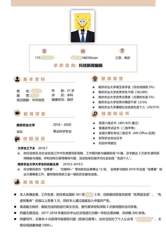 草业国际161团支部作为毕业团支部中的一员,就业是摆在很多毕业同学面前的问题,我们积极响应学院号召,邀请了班内准备工作同学分享了自己的简历,大家快来看看吧,尤其是低年级的同学可以学习一下哦~有很多干货呦。