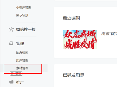 在功能列表中点击“素材管理”,支持添加“图文消息”、“图片”、“语音”、“视频”等材料。