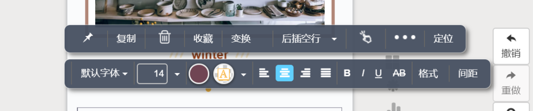 点击编辑区域任一图片都会出现图片工具条,可更改图片大小、位置、格式、变换图片模板。