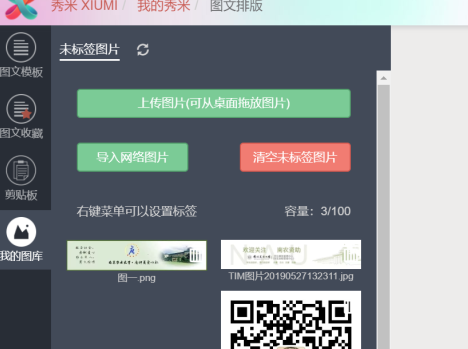 点击左侧“我的图库”即可上传图片,上传完成后可插入正文,多张图片可采用“多图”模板。