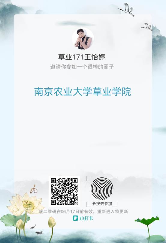 (1)长按识别图中二维码进入“小打卡”小程序,将自己的备注改为“班级+姓名”,如“草业181 张三” 。