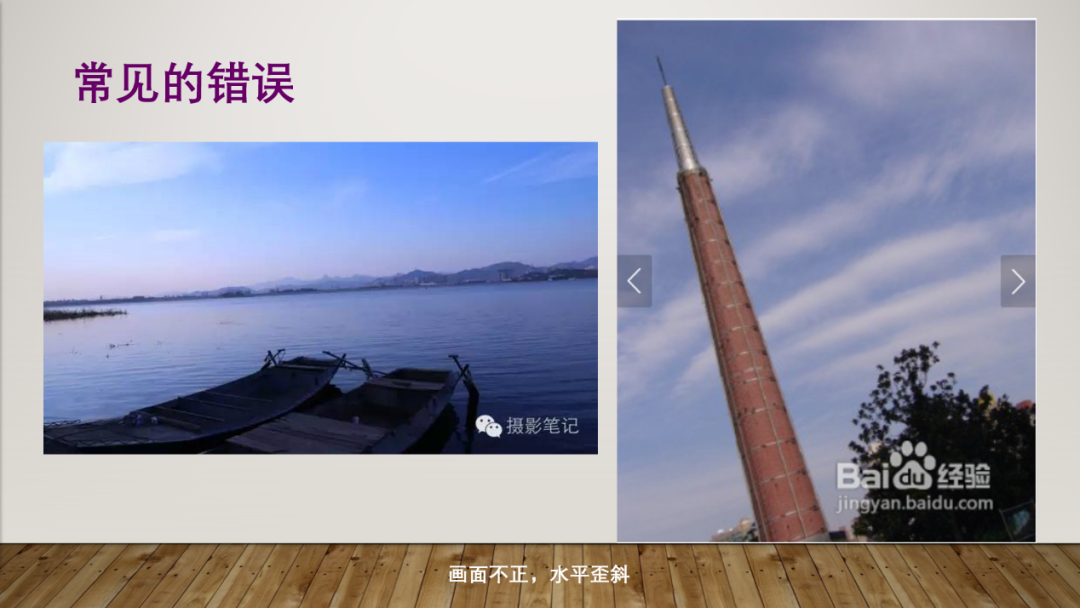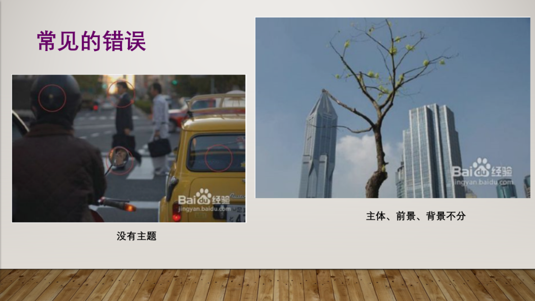 接下来学习了摄影中常见的错误,镜头运用不当,主体距离过近,比例失调,违背常识、背景混乱,无关物横生枝节,干扰主题、前景异物,遮挡主体、主体肢体不全、画面不正,水平歪斜,摇摇欲坠、局部曝光不足或过曝,细节丢失,信息不全、景深过小或过大,主题丢失或被淹没、聚焦不准,画面模糊,而这些错误都需要我们通过不断的练习去改正。
