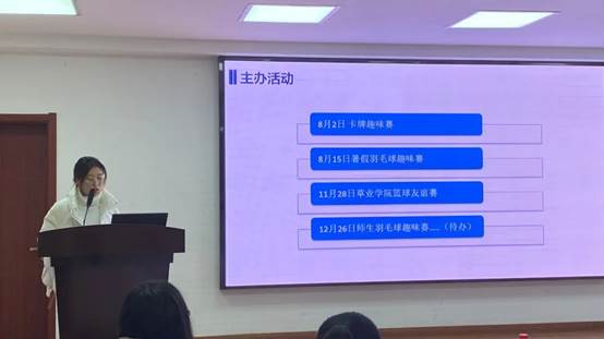 大会第一项议程为大一到大三本科生及研究生各班级年度工作汇报。各班级发言人分别介绍了自身所在班级,总结了班级本年度特色活动,并提出了下一年工作展望。