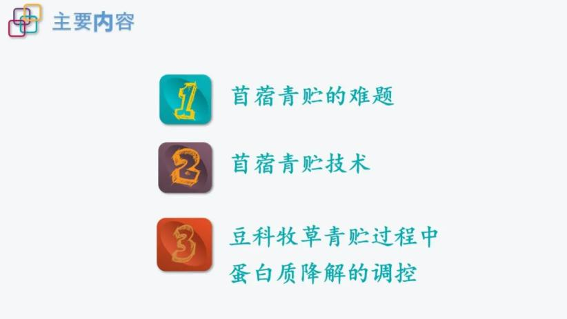 讲座中邵涛教授围绕“苜蓿青贮技术”这个话题,重点介绍了4种苜蓿青贮技术。讲座内容主要分为苜蓿青贮的难题、苜蓿青贮技术、豆科牧草青贮过程中蛋白质降解的调控三个部分。