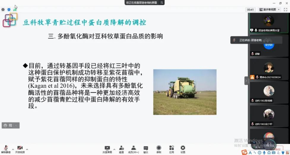 最后,阐明了豆科牧草青贮过程中蛋白质降解的调控过程,强调有效减少豆科牧草青贮过程中蛋白质降解具有极其重要的意义,通过借助青贮添加剂的使用,同时,适当结合青贮管理措施来调制优质的豆科青贮饲料。邵涛教授阐明了凋萎、青贮添加剂以及多酚氧化酶对豆科牧草蛋白质的影响,重点剖析了糖蜜和乳酸菌制剂等青贮添加剂抑制青贮过程中蛋白质降解的原理,分析了添加蛋白剂存在成本高、易腐蚀机械等缺点。邵涛教授还提到了在生产实践中可以通过混合青贮的方式来减少豆科牧草蛋白质降解。