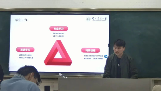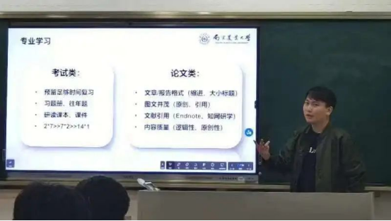 学长从专业学习、学科竞赛、科研训练、社会服务等四个方面分享了自己的经历和建议。例如专业学习方面可以简单分为考类及论文类,针对考试类学习建议同学们把考前突击复习的方式改为平时抽空复习,将大段的复习时间调整成一小段一小段的复习时间,从而提高了学习效率。如果论文类课程,建议我们运用图文结合,引用高质量文献等方法。