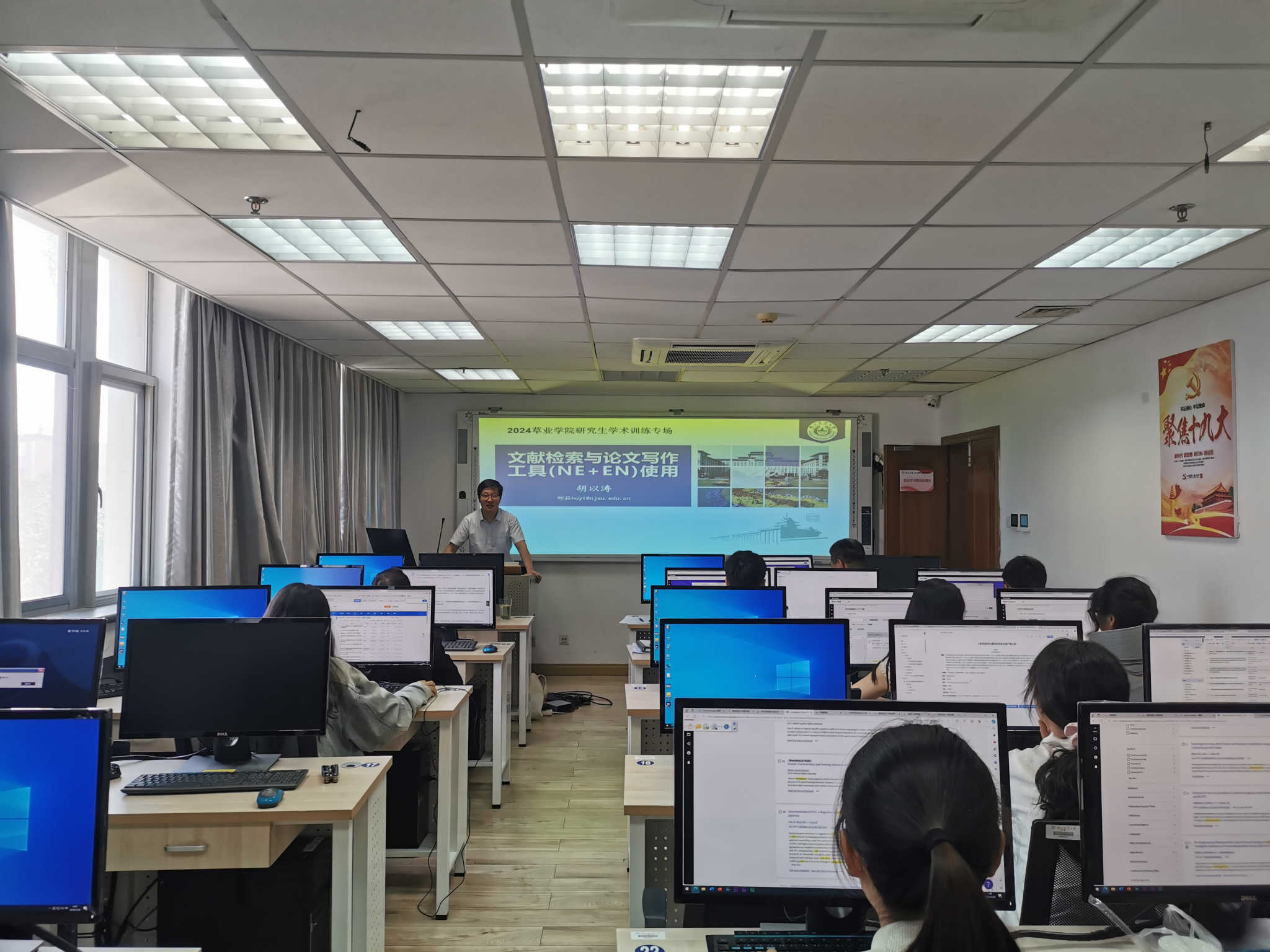 培训班邀请了校图书馆参考咨询部主任胡以涛副教授主讲。胡老师分别从文献检索与获取方法、论文写作工具使用和AI大模型科研应用等三个方面进行详细讲解。强调了学术文献检索前要先确定文献来源和检索方法和策略,再用科学方法获取文献,之后才能对文献进行有效利用。他详细示范了web of Science和中国知网等常用学术文献数据库的检索方法,让大家在电脑上同步进行练习,直到每一名同学都正确掌握。随后他向大家介绍了EndNote和Zetero等文献管理软件的使用方法,指导大家如何有效运用,帮助学生在撰写论文时更高效地引用和整理参考文献。他以《南京农业大学学报》和《园艺研究》这两本中文和英文学术期刊为例,讲解并示范了如何在撰写学术论文时规范引用文献,整理参考文献。最后,他以Kimi、通义千问、文言一心、豆包等工具为例,讲解了在学术论文撰写中,如何有效利用AI生成式人工智能提高论文撰写效率与质量。