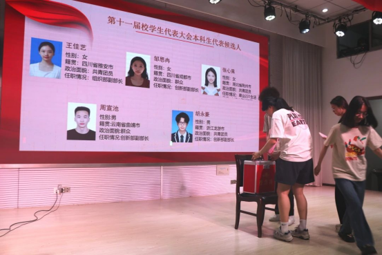 在场同学依次对第十一届校学生代表大会本科生代表候选人和第十一届团委、学生会换届大会投票,由工作人员检查后进行统一收集统计,保证此次选举公平公正公开。