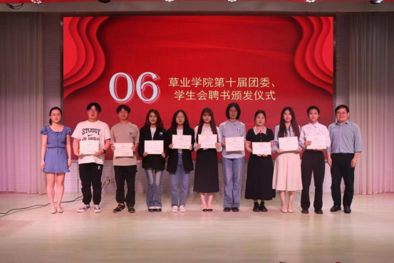 述职汇报结束后,由肖伟华老师与王亦凡老师为第十届团委、学生会成员颁发聘书,由武昕宇老师与周睿同学为社团队长颁发聘书。