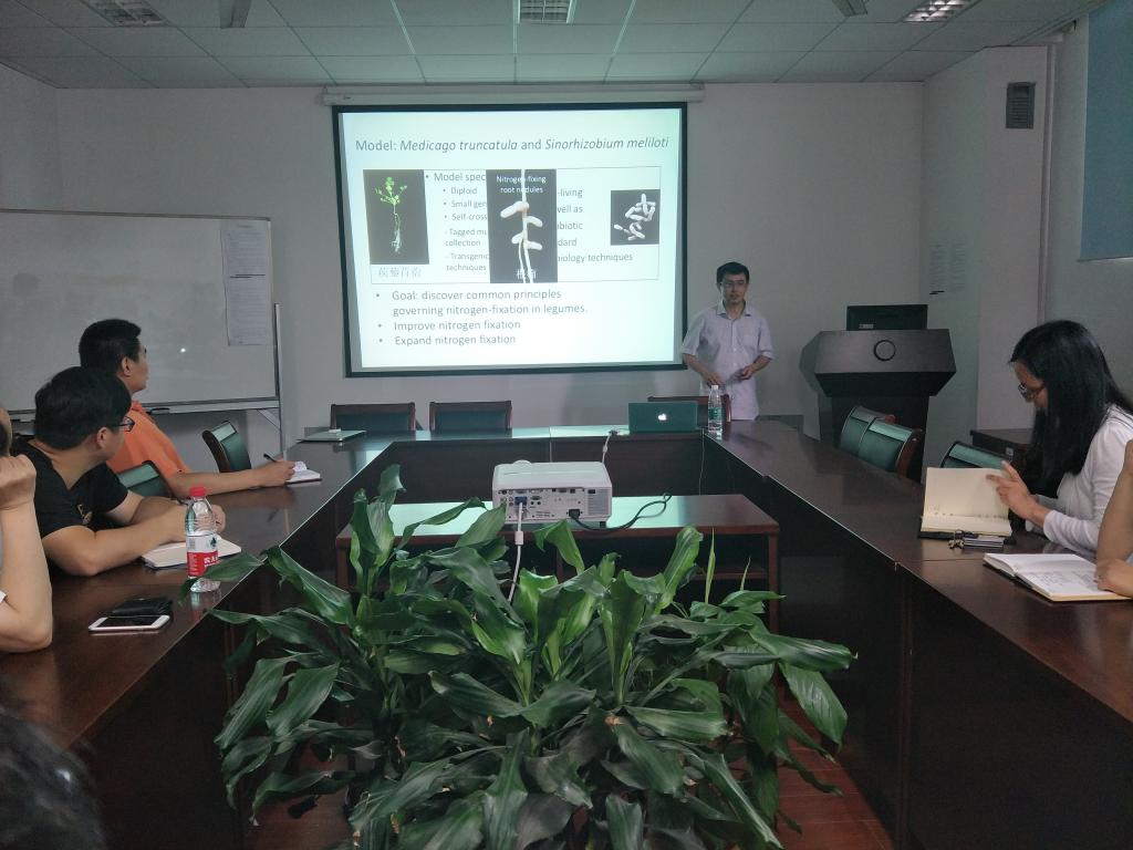 王冬的报告题目为“How legume plants manipulate beneficial microbes for nutrition”。他在报告中讲述了截形苜蓿通过根瘤细胞内的内质网囊泡蛋白特异识别固氮菌细胞膜表面,通过对其膜蛋白的修饰,实现固氮菌在根瘤细胞内的存活、繁殖及养分交流。之后,王冬与学院师生对学术问题开展讨论和交流,气氛活跃,并探讨了将来可以合作的研究领域。
