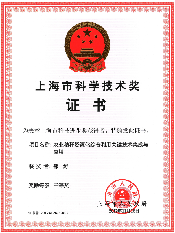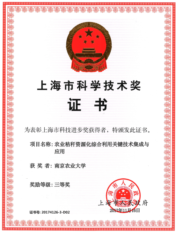 邵涛教授团队与上海市农业科学院等单位联合申报的《农业秸秆资源化综合利用关键技术集成与应用》获上海市科技进步奖三等奖。南京农业大学为第二完成单位,邵涛为第二完成人。